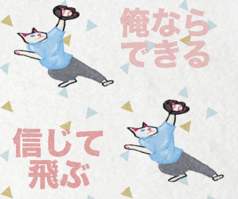 こちらのタオルハンカチは、「俺ならできる」「信じて飛ぶ」というポジティブな言葉と全力でジャンプして試合を守った猫の姿をデザインしました。